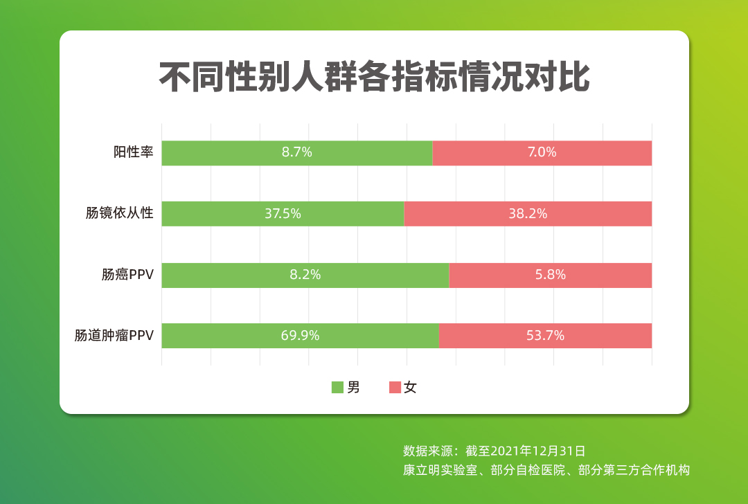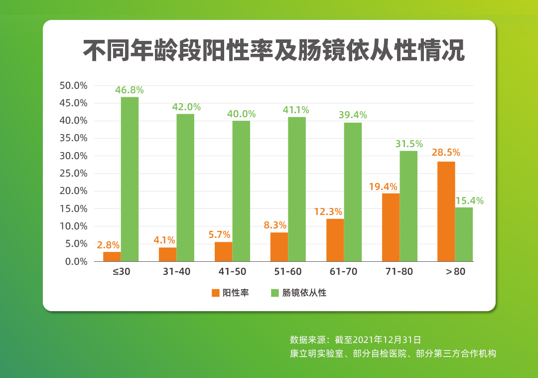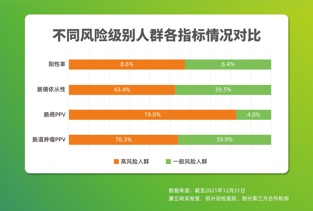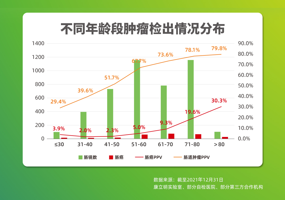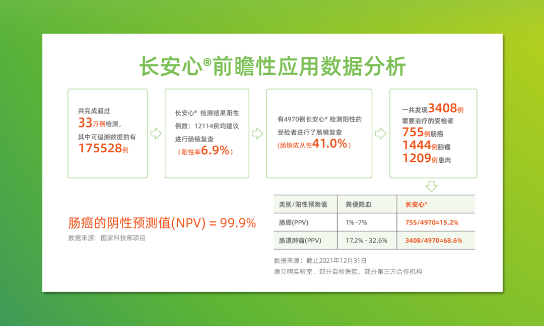 截至2021年12月,作為持續(xù)披露真實(shí)世界應(yīng)用數(shù)據(jù)的腸癌糞便基因檢測(cè)產(chǎn)品,長(zhǎng)安心®共完成33萬(wàn)例前瞻性應(yīng)用檢測(cè),其中175528例應(yīng)用數(shù)據(jù)可追溯,12114例受檢者長(zhǎng)安心®檢測(cè)結(jié)果陽(yáng)性(陽(yáng)性率6.9%),其中4970例長(zhǎng)安心®檢測(cè)結(jié)果陽(yáng)性的受檢者進(jìn)行了腸鏡復(fù)查(腸鏡依從性41.0%),一共發(fā)現(xiàn)3408例需要治療的受檢者,其中755例腸癌,1444例腺瘤,1209例息肉。長(zhǎng)安心®對(duì)腸道腫瘤的預(yù)測(cè)值(PPV)為68.6%(其中腸癌的陽(yáng)性預(yù)測(cè)值為15.2%),來(lái)自國(guó)家科技部項(xiàng)目的數(shù)據(jù)顯示,長(zhǎng)安心®的陰性預(yù)測(cè)值更是高達(dá)99.9%。