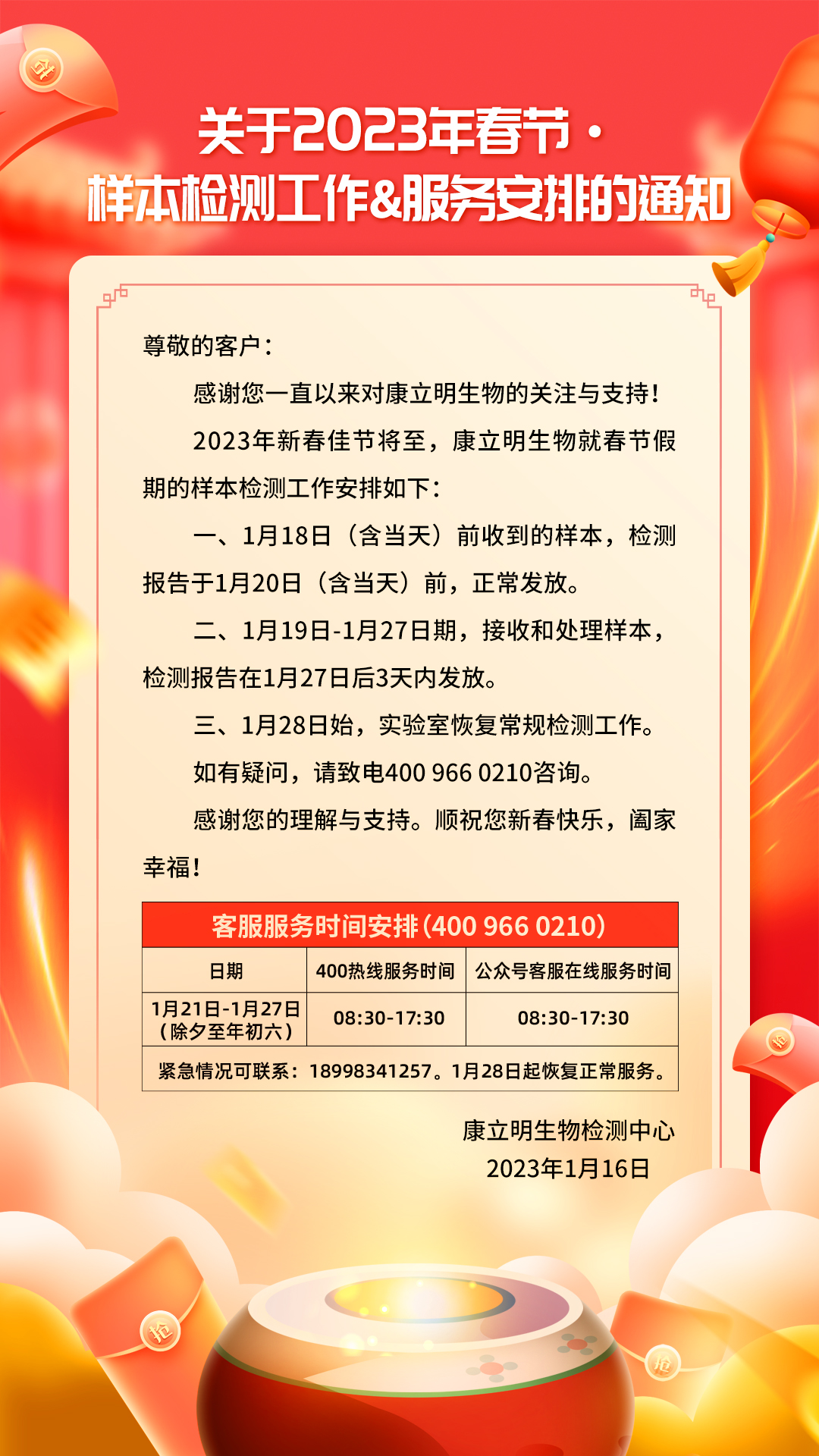 關于2023年春節·樣本檢測工作&服務安排的通知