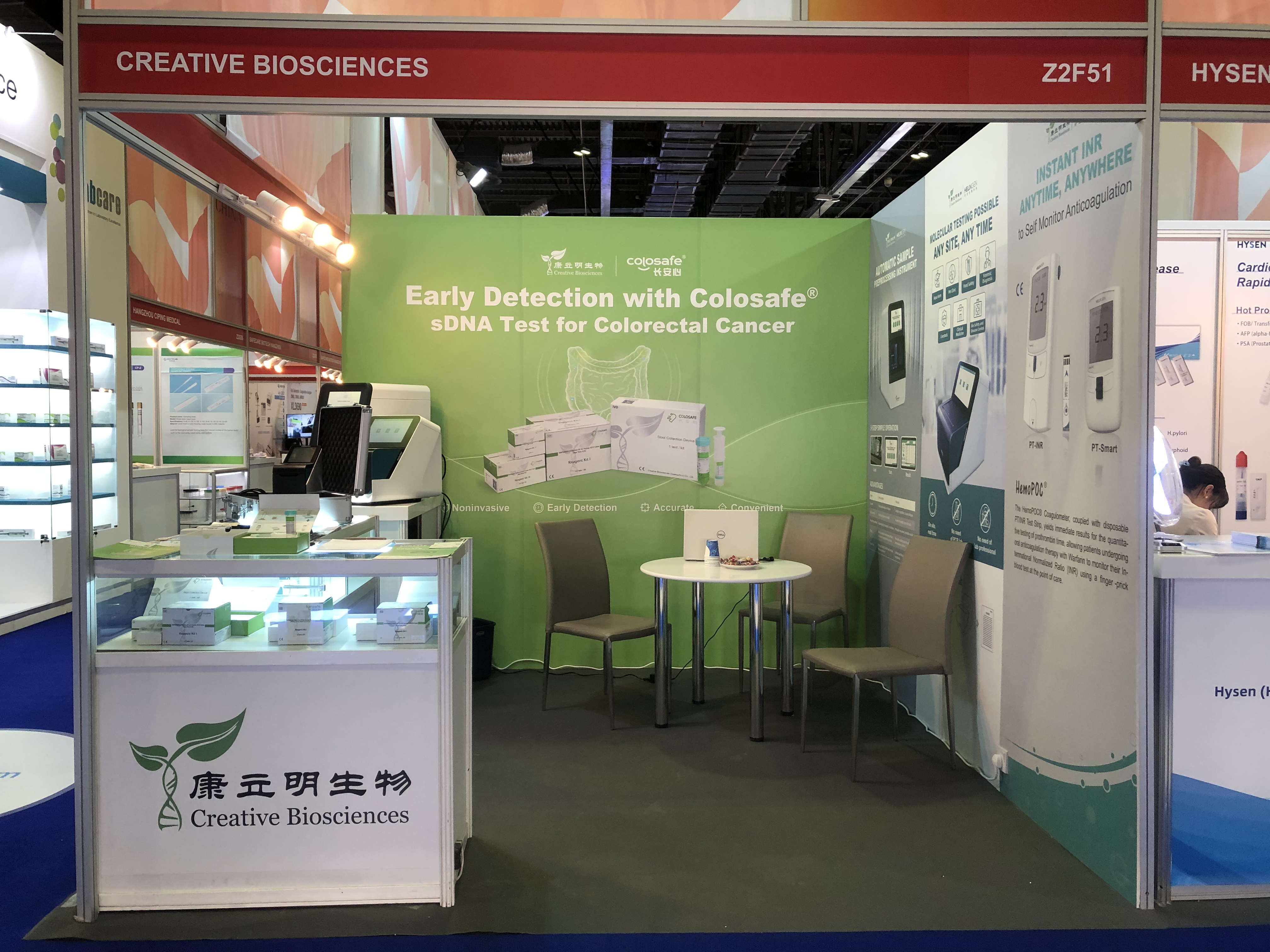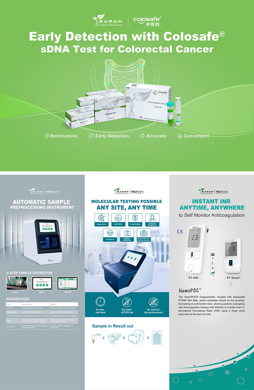 本次盛會(huì),康立明生物攜長(zhǎng)安心®糞便DNA腸癌檢測(cè)、久安心®膀胱癌基因檢測(cè)、會(huì)安心®肺癌基因檢測(cè)、全自動(dòng)樣本預(yù)處理儀以及康立明全資子公司好芝生物產(chǎn)品HelixPOC®全自動(dòng)微流控?zé)晒?/span>PCR一體機(jī)、HemoPOC®凝血檢測(cè)系統(tǒng)赴展。