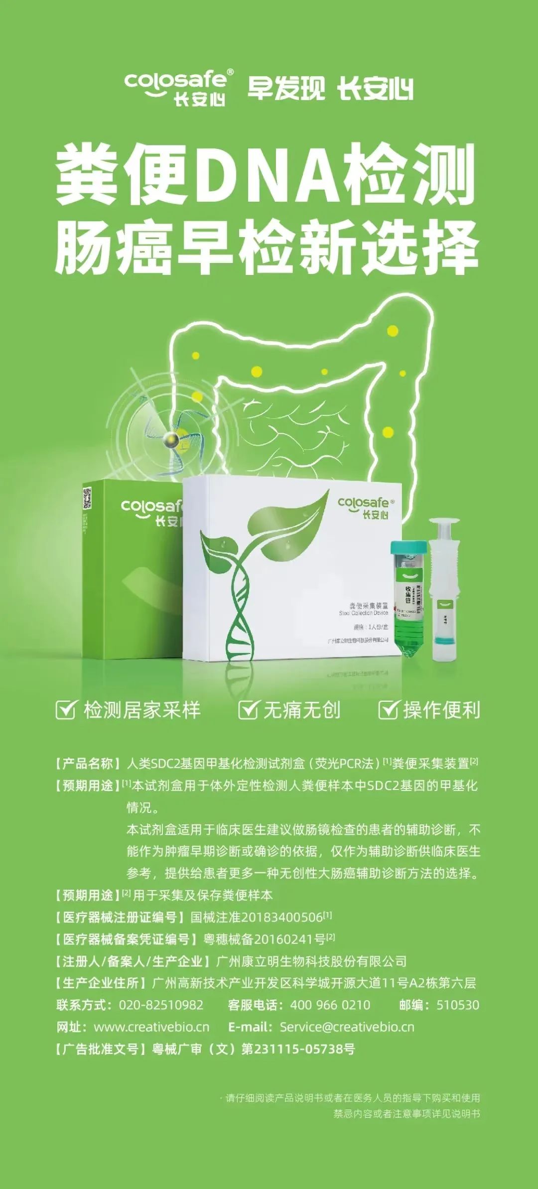 長(zhǎng)安心®人類SDC2基因甲基化檢測(cè)試劑盒(熒光PCR法)于2018年11月20日獲國(guó)家藥監(jiān)局頒發(fā)的三類醫(yī)療器械注冊(cè)證書,是中國(guó)率先獲批上市的腸癌糞便基因檢測(cè)試劑盒,成為國(guó)內(nèi)腸癌無(wú)創(chuàng)DNA檢測(cè)破冰之作。長(zhǎng)安心®糞便基因檢測(cè)通過(guò)解讀糞便中脫落腫瘤細(xì)胞的基因異常改變,幫助醫(yī)生發(fā)現(xiàn)患者早期腸癌病變情況,有希望將結(jié)直腸癌阻斷在早期階段,從而達(dá)到預(yù)防和根治結(jié)直腸癌的目的。