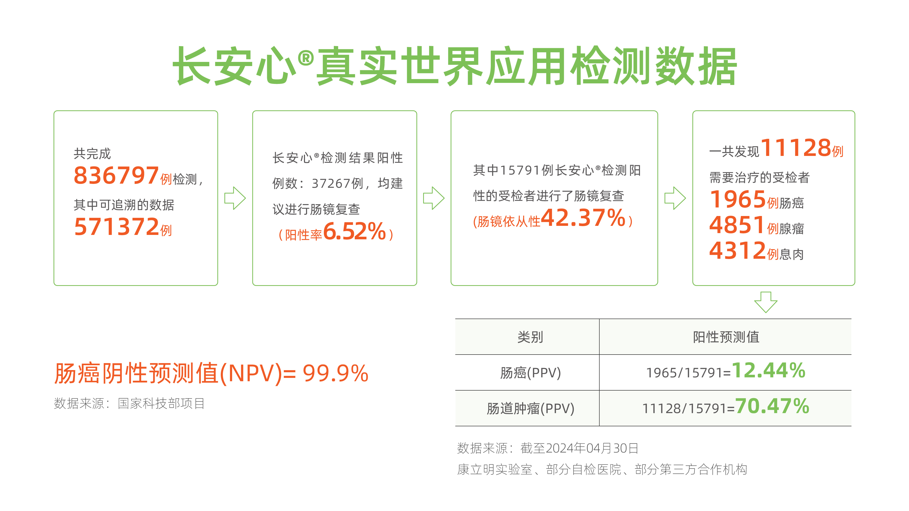 截至2024年4月30日,長安心®共完成836797例檢測,其中可追溯數據571372例。檢測結果陽性37267例(陽性率6.52%),均建議進行腸鏡復查。其中,15791例檢測陽性受檢者進行了腸鏡復查(腸鏡依從性42.37%),共發現11128例需要治療的受檢者,其中腸癌1965例、腺瘤4851例、息肉4312例。長安心®腸癌陽性預測值(PPV)12.44%,腸道腫瘤陽性預測值(PPV)70.47%,檢測性能優異。