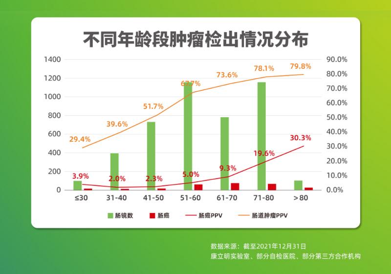 截至2021年12月,長安心®共完成33萬例前瞻性篩查,其中175528例篩查數據可追溯,12114例受檢者長安心®檢測結果陽性(陽性率6.9%),其中4970例長安心®檢測結果陽性的受檢者進行了腸鏡復查(腸鏡依從性41.0%),一共發現3408例需要治療的受檢者,其中755例腸癌,1444例腺瘤,1209例息肉。長安心®對腸道腫瘤的陽性預測值(PPV)為68.6%(其中腸癌的陽性預測值為15.2%)。